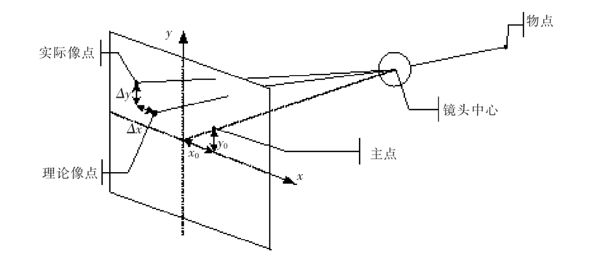 如某物方空间点被j 个摄站的相机拍到, 根据工业摄影测量的基本原理, 在解算该物方空间点坐标时, 共存在j 个共线方程, 多位置摄影如图1 所示。 x0、y0 和f 称为照片的内方位元素,用来确定投影中心在像空间坐标系中对照片的相对位置。 实际成像时, 主点的像平面坐标不严格为零, 存在一微小值,记为(x0,y0)。 另外镜头的径向畸变、偏心畸变和像平面畸变等干扰也会造成像点的成像位置存在偏差(Δx,Δy),如图2 所示。 其中ai、bi、ci 等9 个元素是相机拍照瞬间3 个独立旋转角ω、φ 和κ 的函数,通过以上参数约束可以解算出该物方空间点的三维坐标[6-7]。