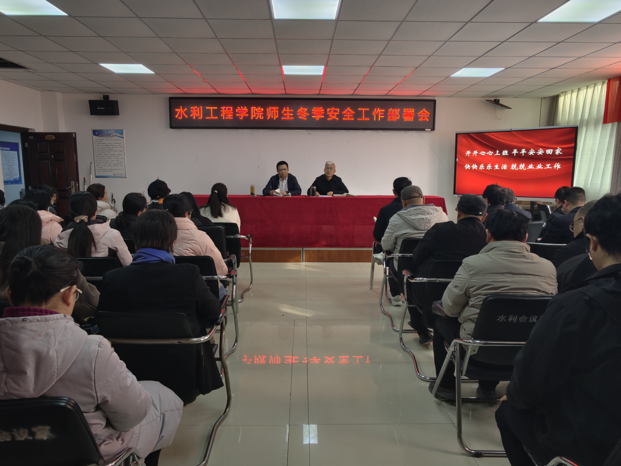 12月2日,水利工程学院在SX5310会议室召开师生冬季安全工作部署会,院领导及全体教师参加会议,会议由党总支书记王建设主持。