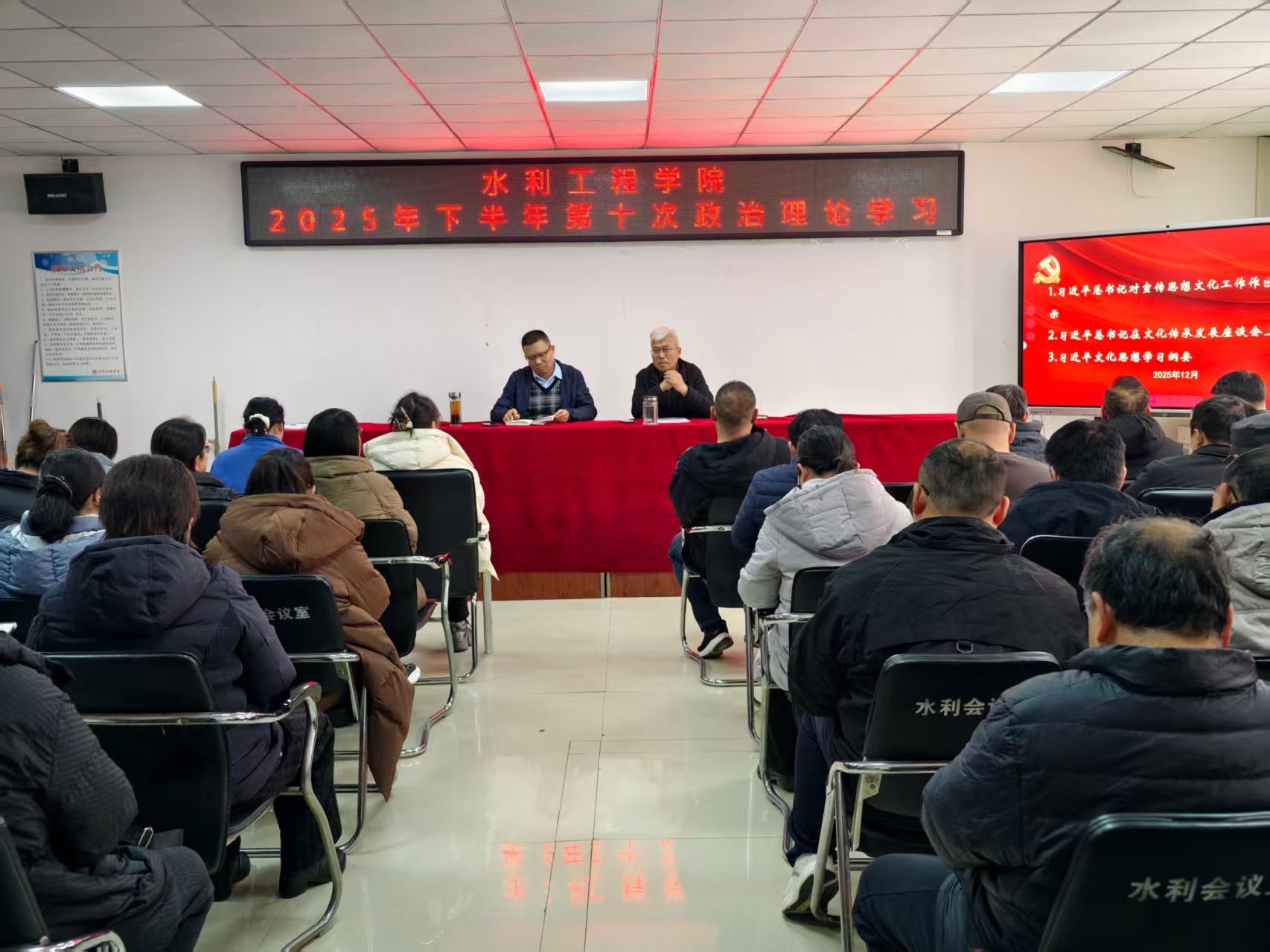2025年12月30日,水利工程学院在SX5310会议室召开2025年下半年第十次政治理论学习会。党总支书记王建设等院领导及全体教师参加会议,会议由院长雷恒主持。