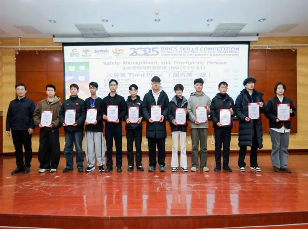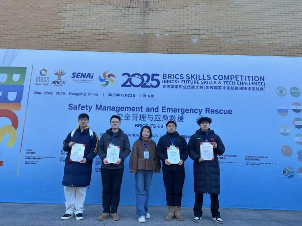 12月22日至25日,2025年金砖国家职业技能大赛(金砖国家未来技能和技术挑战赛)安全管理与应急救援赛项国际总决赛在东营职业学院举行,来自金砖国家及“金砖+”国家的78支参赛队伍同台竞技。水利工程学院学生武增辉、张国栋、侯焱升、王宇组成的团队在教师刘冉冉、杨春景的指导下,从众多强劲对手中脱颖而出,首次参赛即斩获铜奖。