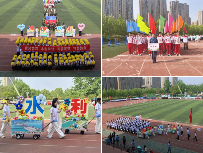 开幕式上,水利方阵惊艳亮相:四辆花车分别展示“万里黄河第一坝”三门峡、“黄河明珠”小浪底、“高峡平湖”三峡、“地上天河”南水北调沙河渡槽;队员们手翻红黄,高擎“黄河奔涌、水利争锋、青春筑梦、气势如虹”条幅,尽显水利豪情。