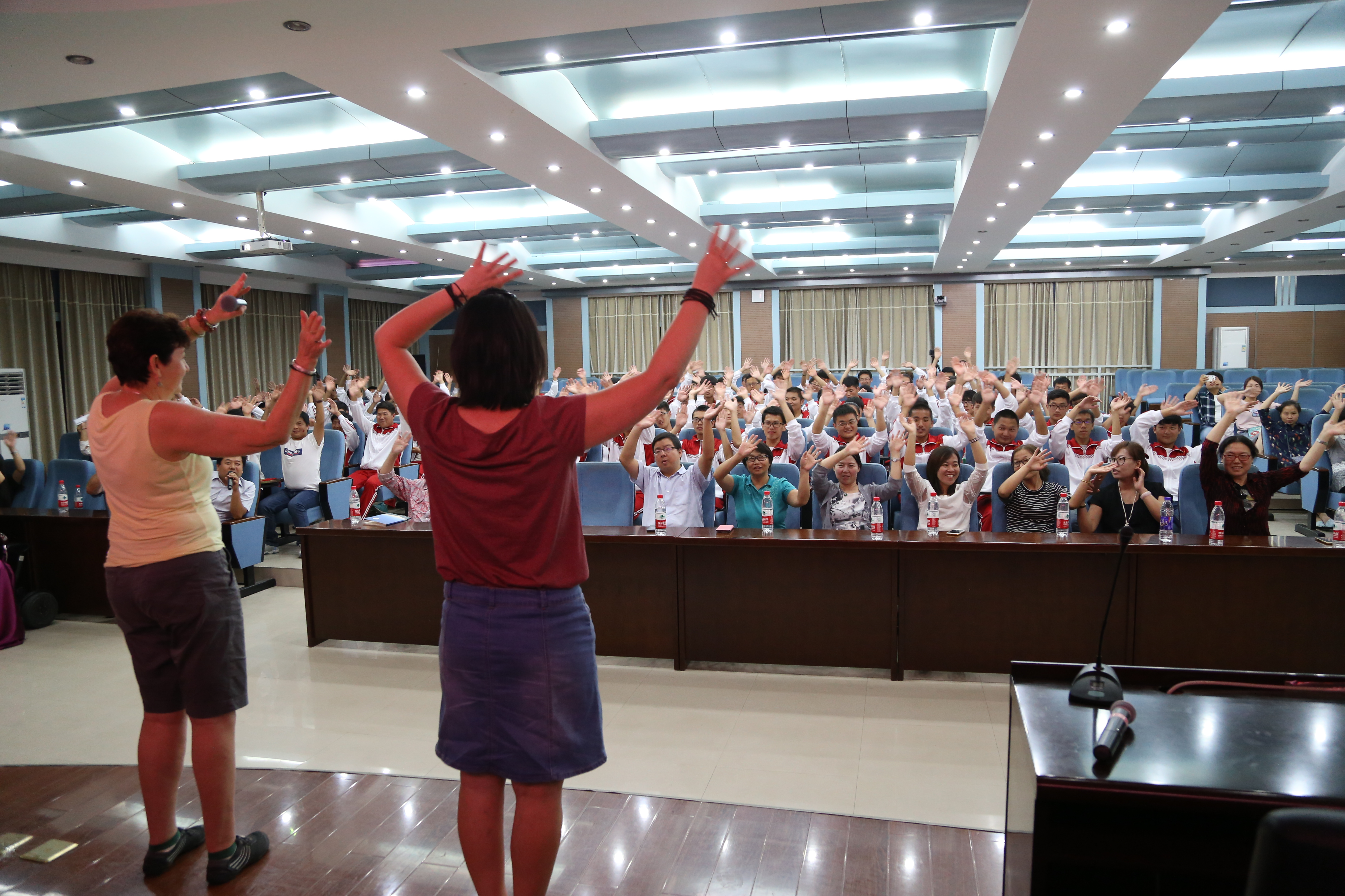 接下来, Ian 用精美漂亮课件向同学们展示了澳大利亚的风土人情、分享了那里的年轻人如何生活、学习的;Lana和Paula两位女士,现场示范动作,随着欢快的音乐《home among the gum tree》,在她们的带动下,师生共同合着节奏,拍着手,一起跳起来;Robert 针对同学们比较关心如何学好英语给出了一些好的建议。为了增加报告的趣味性和鼓励同学们与外教交流,设计有小竞猜等环节。参与互动的同学,都收到了外教送的考拉、糖果等小礼品。水工1603班闫浩开心得说“我用了洪荒之力与外教交流,还有小礼物,很高兴!”
