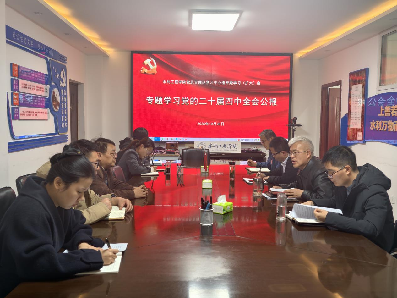 10月28日,水利工程学院党总支理论学习中心组召开专题学习(扩大)会议,集中学习《中国共产党第二十届中央委员会第四次全体会议公报》。院领导、总支委员、五办主任参加会议,会议由党总支副书记李建主持。