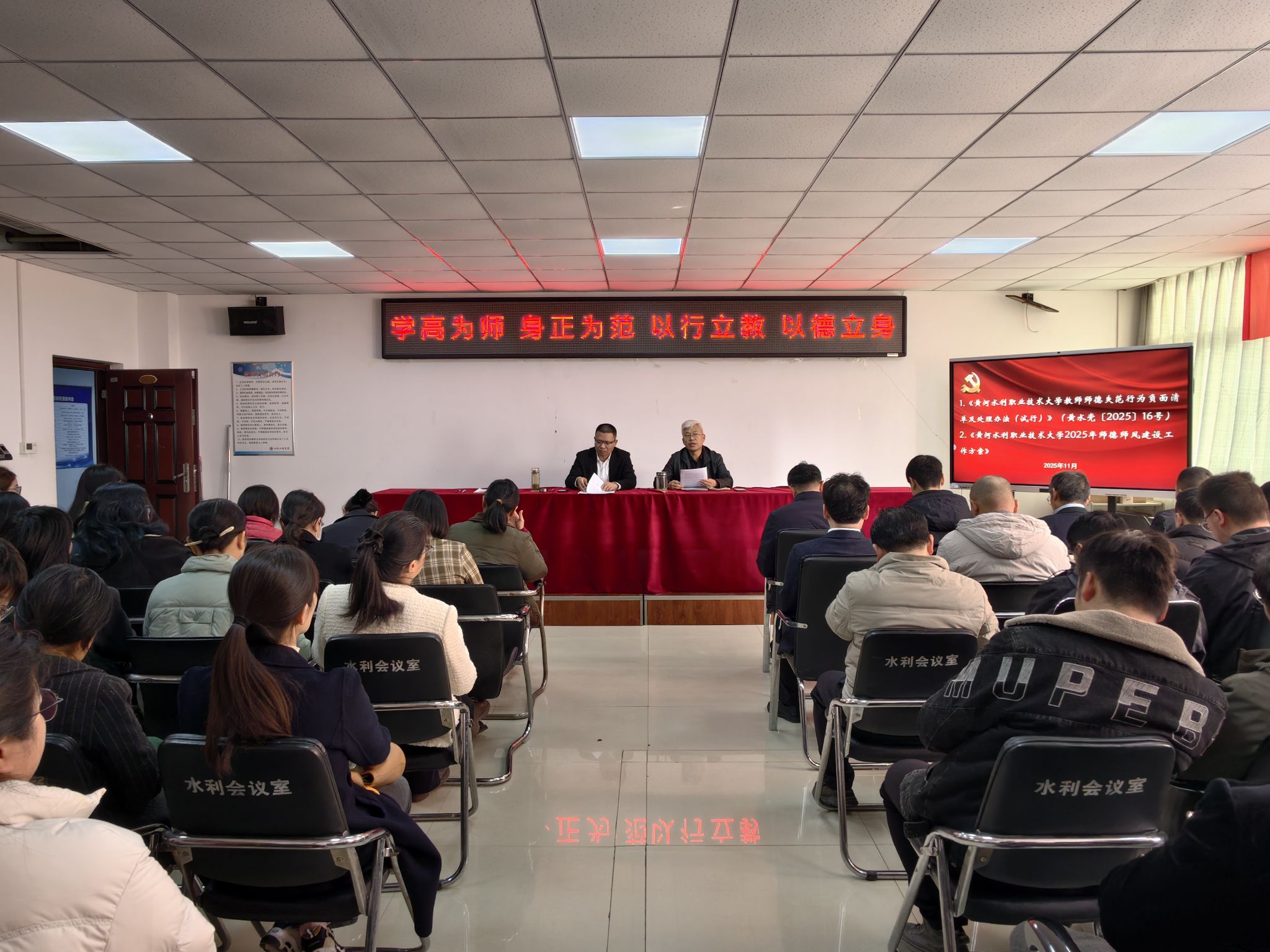 会上,党总支书记王建设带领全体教师认真学习了《黄河水利职业技术大学教师师德失范行为负面清单及处理办法(试行)》和《黄河水利职业技术大学2025年师德师风建设工作方案》两个重要文件。他强调,教师是教育事业的第一资源,是推动学院发展的核心力量,也是教书育人的实施者,师德师风直接关系到学风校风,直接关系到人才培养质量。全体教师要深刻理解“学高为师,身正为范,以行立教,以德立身”的内涵,把师德师风作为从教立教的首要标准,真正做到以德立身、以德施教、以德育人。全体教师要严格对照负面清单内容,自我查摆、主动整改,做到警钟长鸣、防患未然。