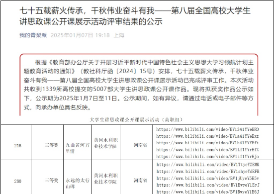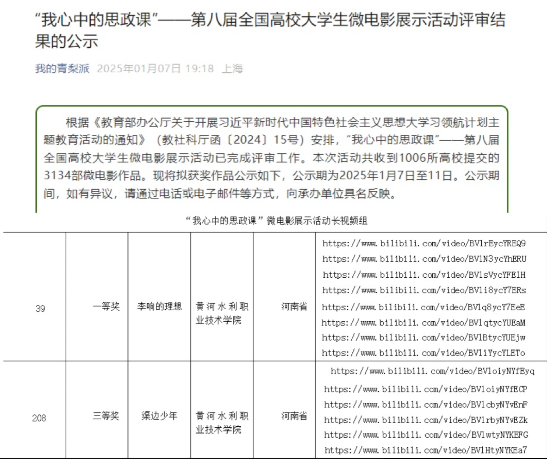 1月7日,教育部第八届全国高校大学生微电影展示活动和大学生讲思政课公开课展示活动评审结果公示,我校马克思主义学院申报的4部作品入选。其中,微电影《李响的理想》获长视频组全国一等奖,《渠边少年》获长视频组全国三等奖,大学生讲思政课公开课《九曲黄河万里情》《永远的太行山碑》分获全国三等奖,实现我校在此项赛事中新的突破。