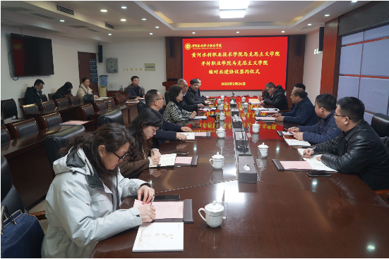 为深入贯彻习近平总书记关于思政课建设的重要指示精神,全面落实河南省教育工委、省教育厅着力推进全省思政课内涵建设的重要部署,2月24日,我校与开封职业学院马克思主义学院结对共建签约仪式在行政楼二楼会议室举行。开封职业学院党委书记储建新,党委副书记、副校长、马克思主义学院院长马纪岗等一行5人,我校党委书记周保平,校党委副书记、工会主席杨士恒,河南省高校青年宣讲名师乔新杰,马克思主义学院领导班子成员出席会议。会议由杨士恒主持。