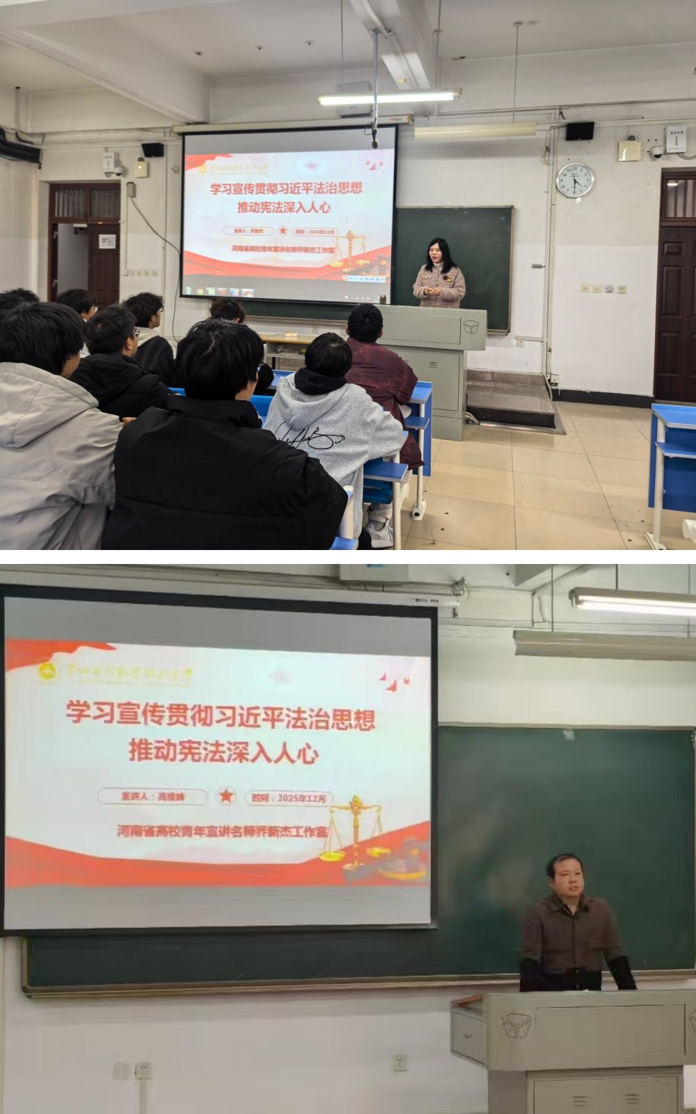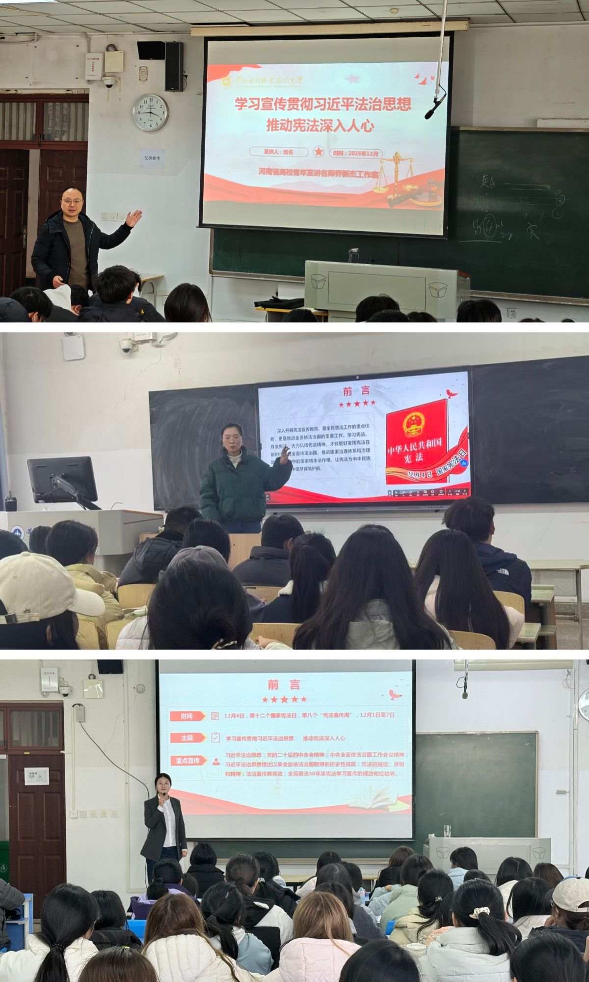 2025年12月4日是第十二个国家宪法日。为深入学习贯彻习近平法治思想,推动宪法深入人心,河南省高校青年宣讲名师乔新杰工作室成员、思想道德与法治教学团队纷纷走进学生课堂,以“青年讲给青年听”的鲜活形式,开展宪法宣传活动。累计1000余名青年大学生参与此次活动。