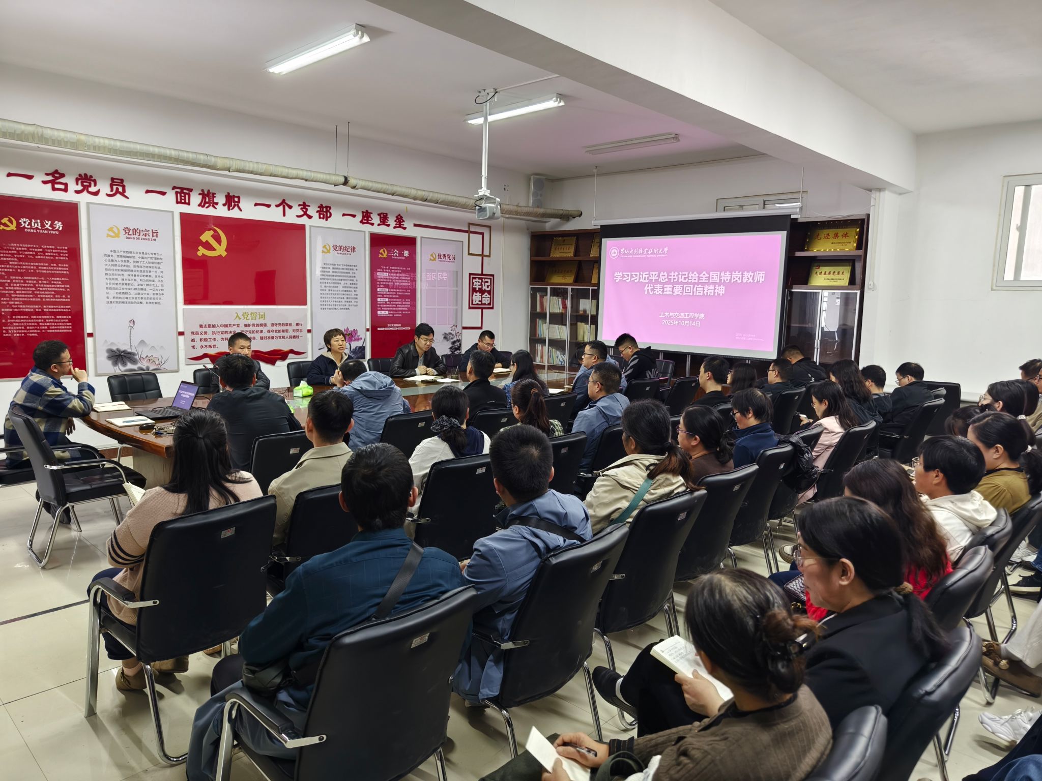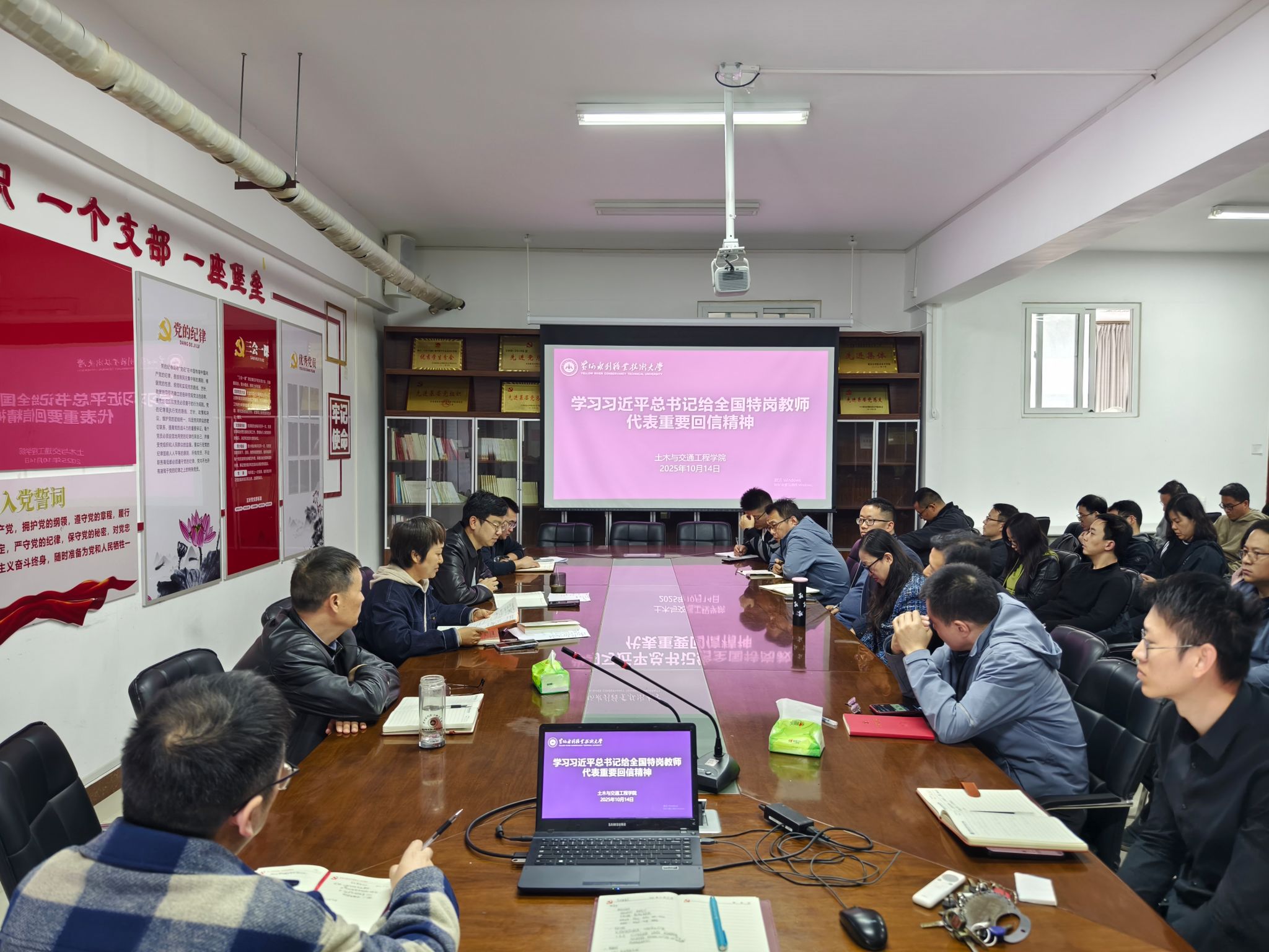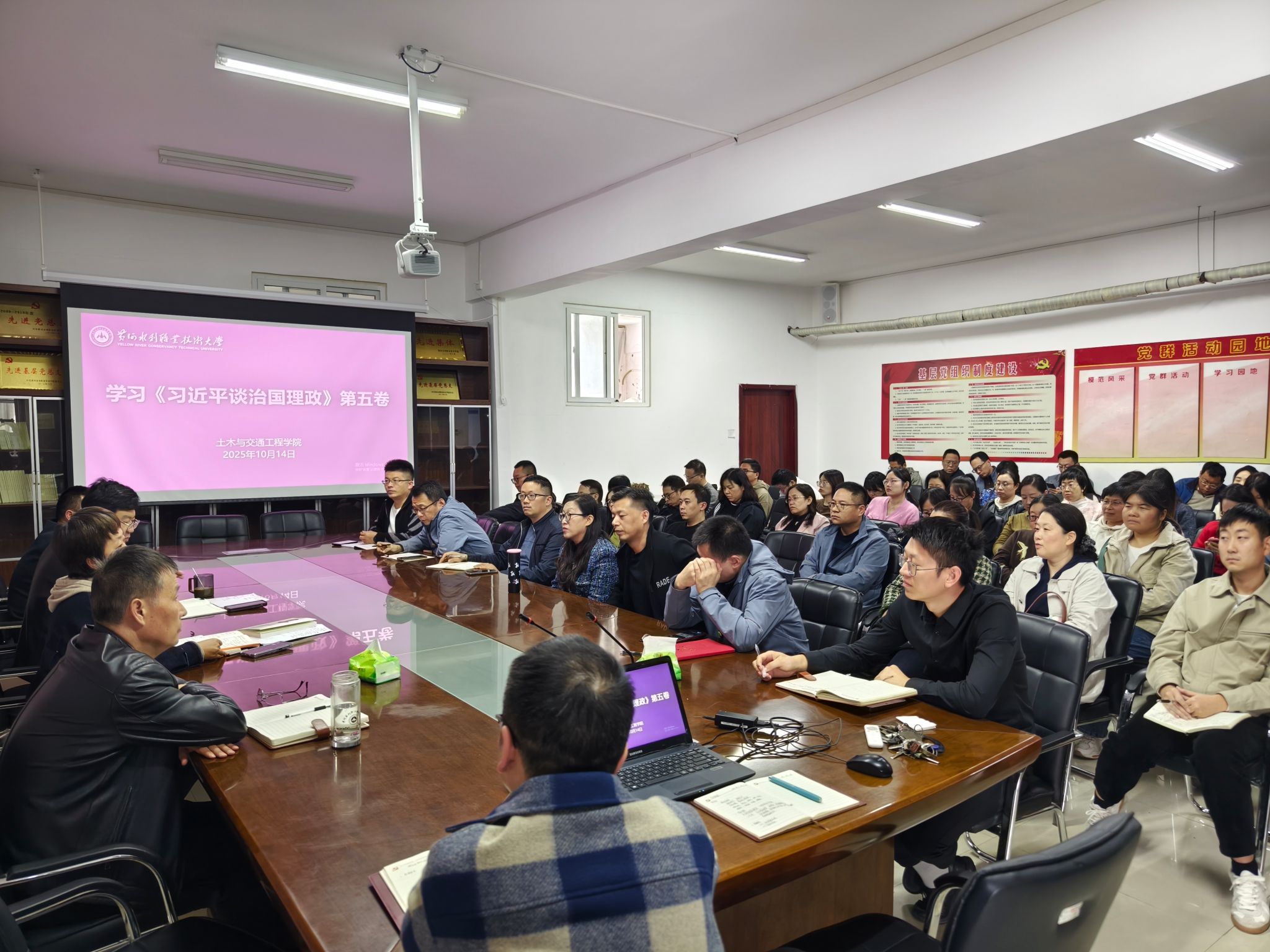 为持续深入学习贯彻习近平新时代中国特色社会主义思想,进一步贯彻落实习近平总书记关于教育的重要论述精神,10月14日,土木与交通工程学院组织教职工传达学习《习近平谈治国理政》第五卷和习近平总书记给全国特岗教师代表重要回信精神,增强对党的创新理论的政治认同、思想认同、理论认同、情感认同,引导全体教职工始终在思想上政治上行动上同以习近平同志为核心的党中央保持高度一致。