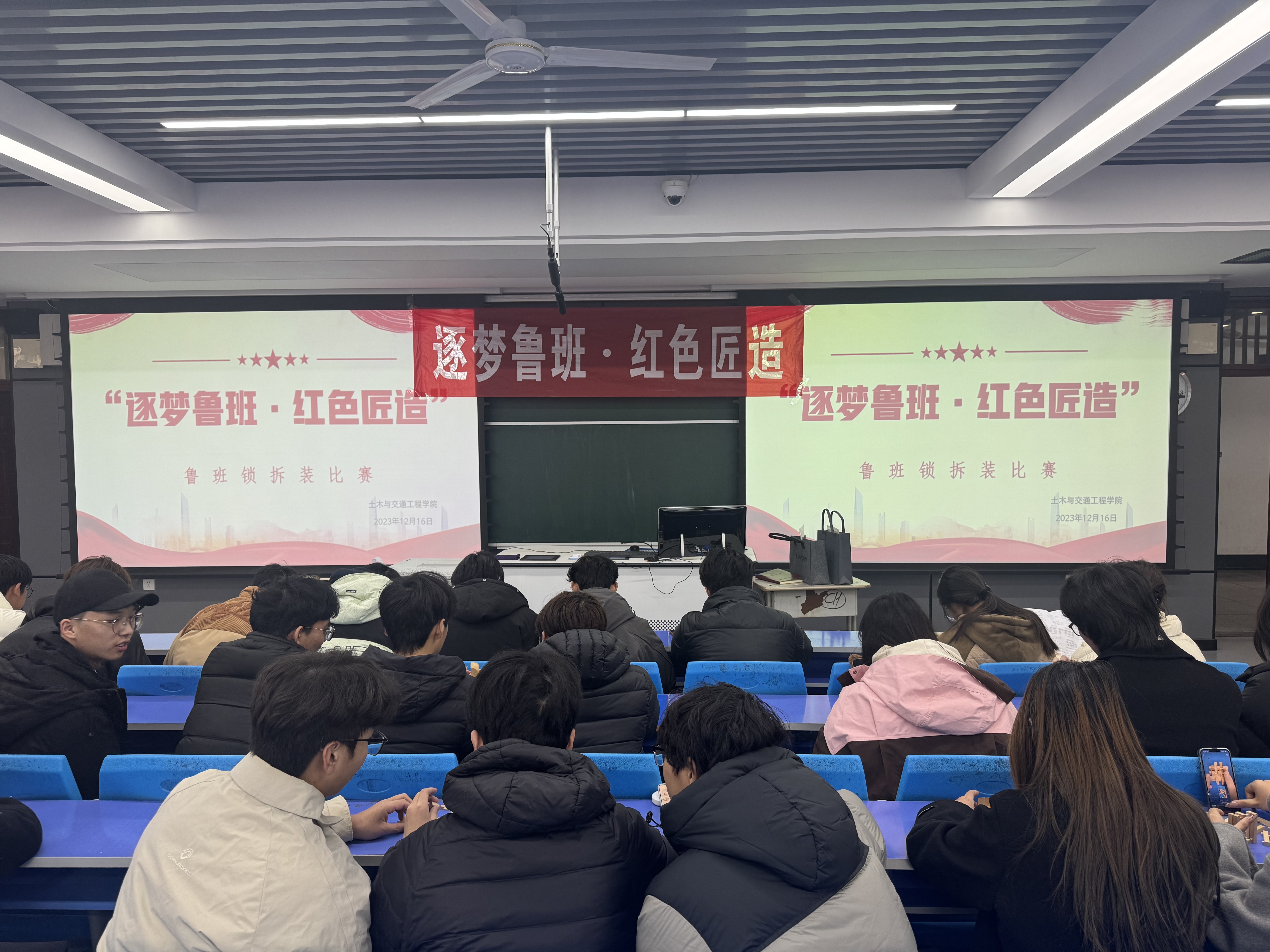 为弘扬鲁班文化,传承工匠精神,12月16日,土木与交通工程学院在JX2202举办“逐梦鲁班·红色匠造”鲁班锁拼装比赛,学院各年级学生踊跃参与。