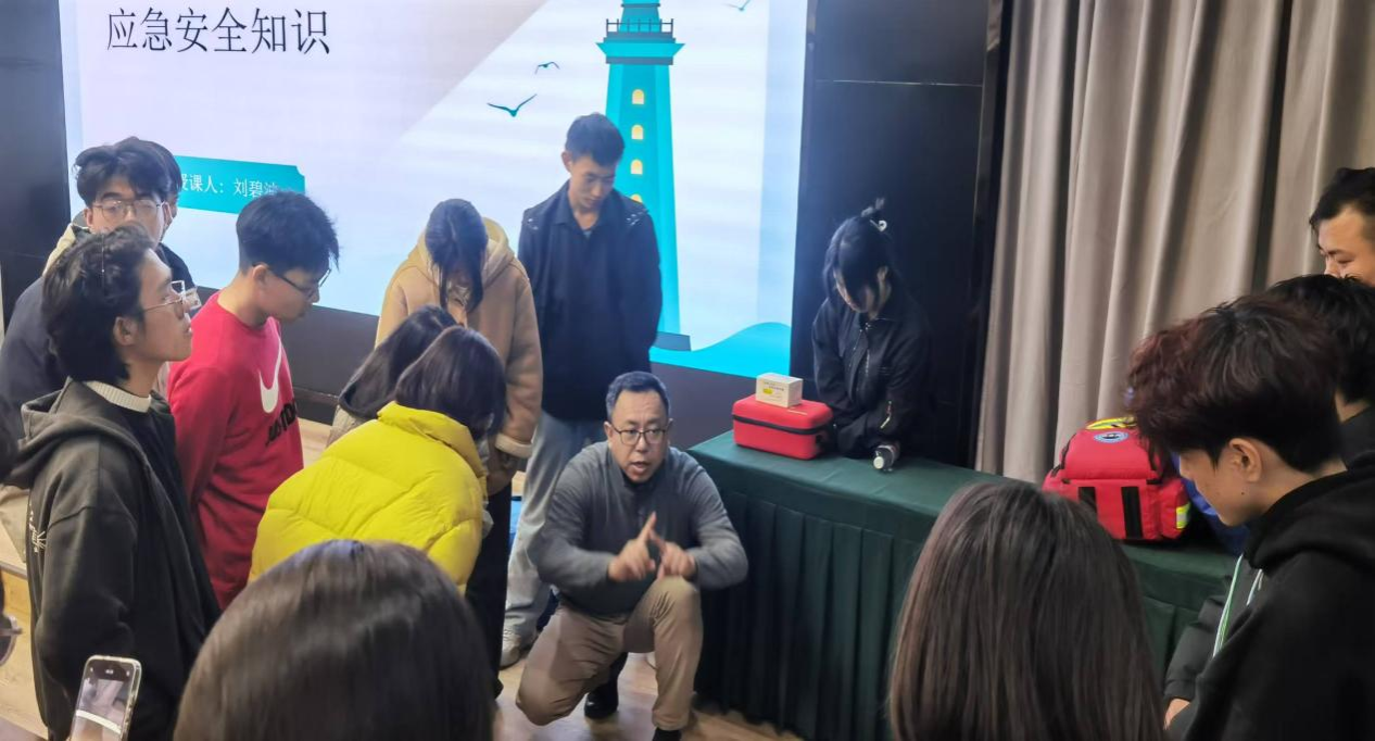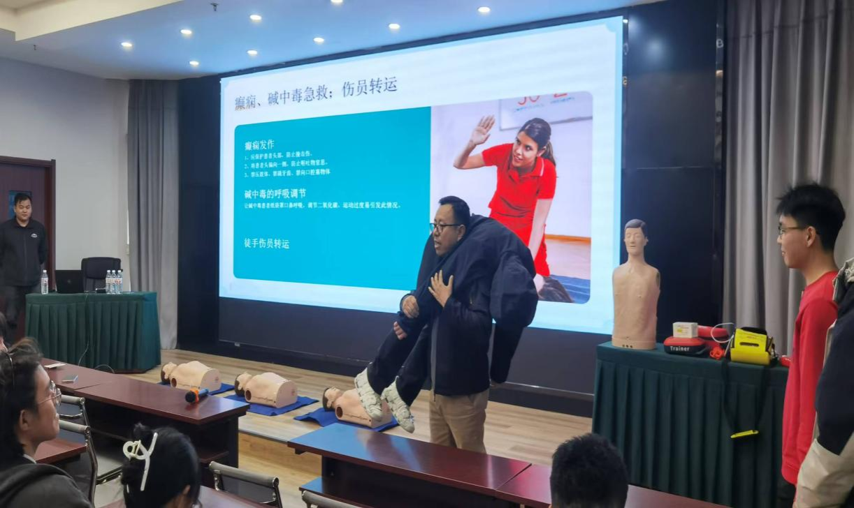 应急医疗救护部分是本次讲座的重点之一。刘碧波老师详细讲解了心肺复苏(CPR)的操作流程、按压要点及人工呼吸注意事项,并介绍了自动体外除颤器(AED)的使用方法,强调“黄金四分钟”对挽救心搏骤停患者生命的关键意义。此外,他还讲解了常见急症(如气道异物梗阻、卒中、心肌梗死)的初步识别与应对措施,并演示了多种情况下伤员的安全搬运转运技术,以避免造成二次伤害。