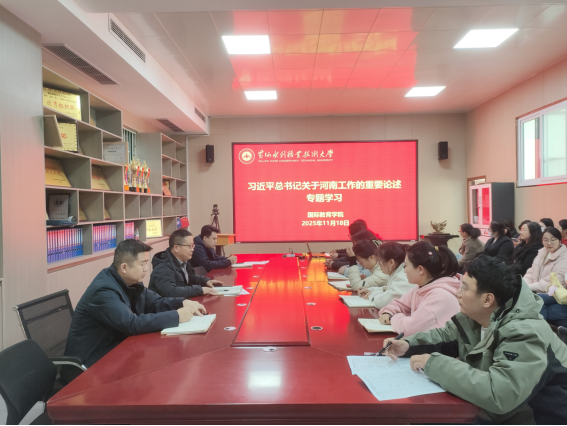 为贯彻落实《黄河水利职业技术大学2025年下半年政治理论学习及思想道德教育计划》学习要求,11月18日,国际教育学院传达学习习近平总书记在河南考察时的重要讲话和习近平总书记关于河南工作的重要论述,引导全院教师深刻领会习近平总书记重要讲话精神的核心要义和实践要求,自觉将讲话精神融入日常教学和理论研究工作中,引导广大青年学生坚定理想信念,投身强国建设。
