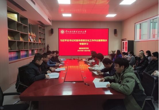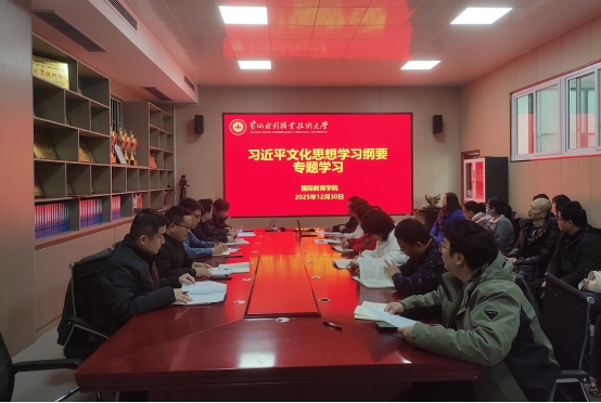 为贯彻落实《黄水2025年下半年政治理论学习及思想道德教育计划》学习要求,12月30日,国际教育学院组织教职工传达学习习近平总书记对宣传思想文化工作作出重要指示、习近平总书记在文化传承发展座谈会上的讲话和习近平文化思想学习纲要,引导广大师生进一步学懂弄通做实习近平新时代中国特色社会主义思想,深入学习贯彻习近平文化思想,更加深刻领悟“两个确立”的决定性意义,增强“四个意识”、坚定“四个自信”、做到“两个维护”,为以中国式现代化全面推进强国建设、民族复兴伟业而努力奋斗。