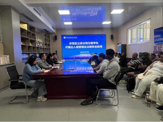 2026年4月10日下午3点,国际教育学院在JX7408会议室举办留学生出入境管理及法制安全教育活动。本次活动由学院党总支书记楚万强主持,示范区公安分局张警官、郗警官担任主讲,23名南非留学生及留学生管理团队教师共同参与。
