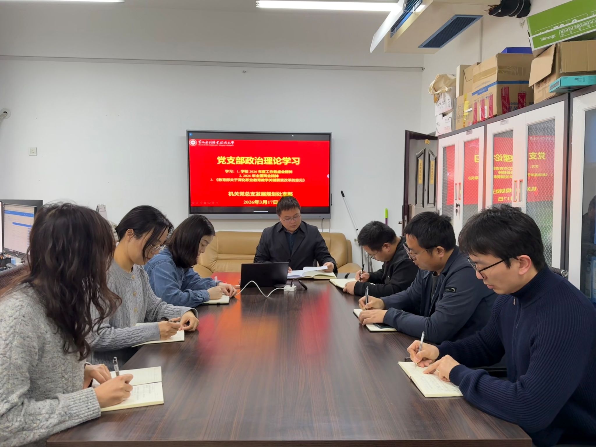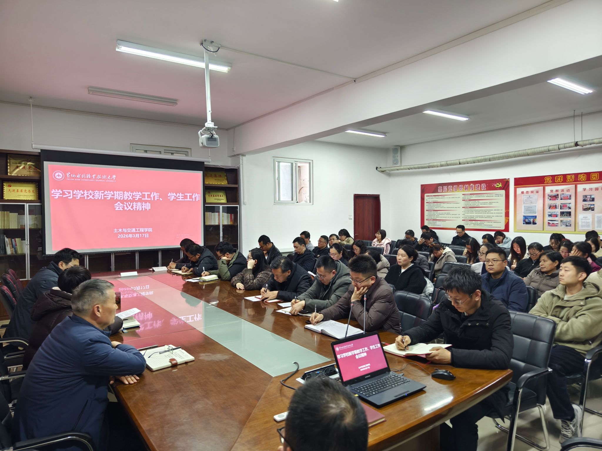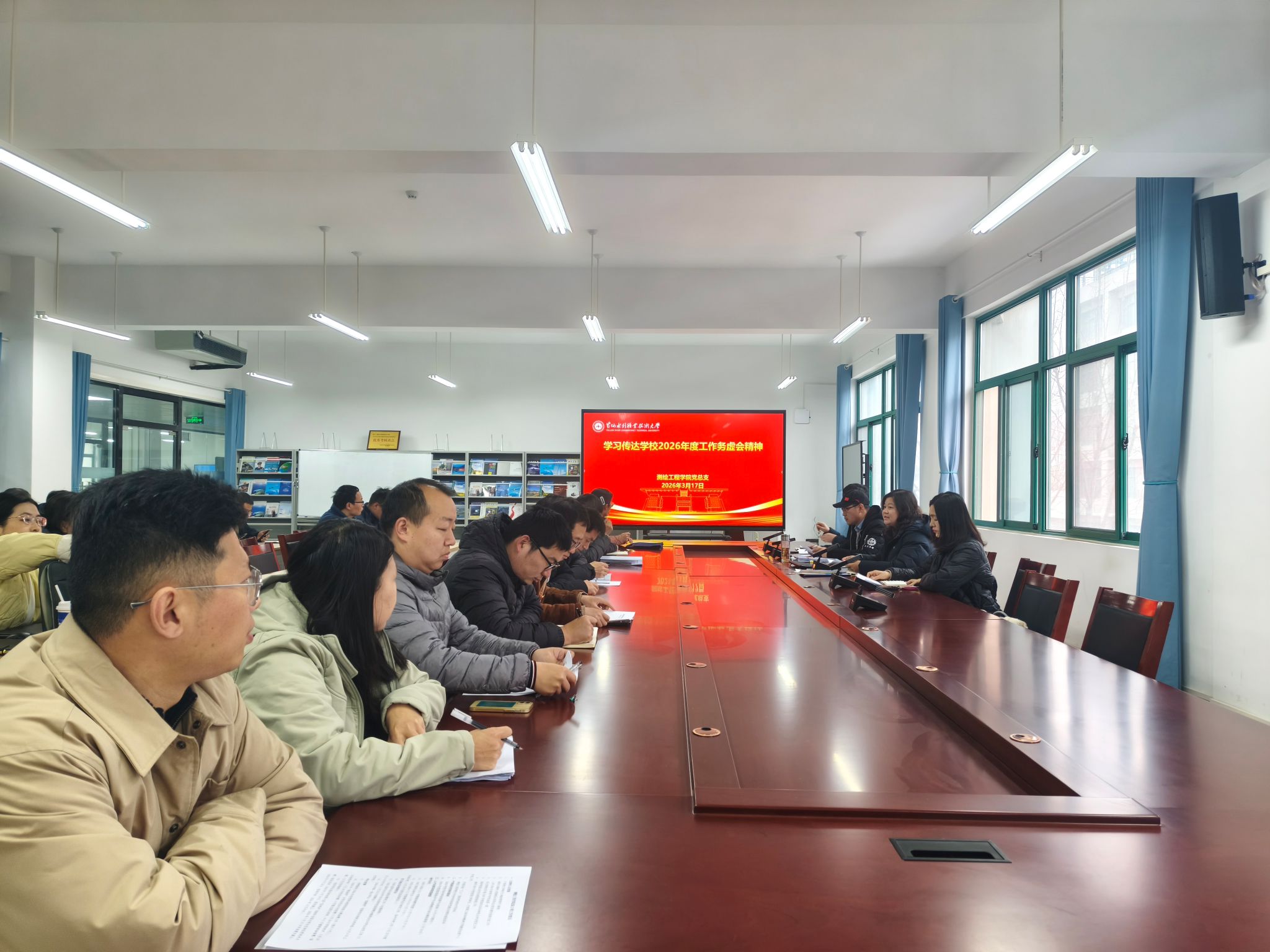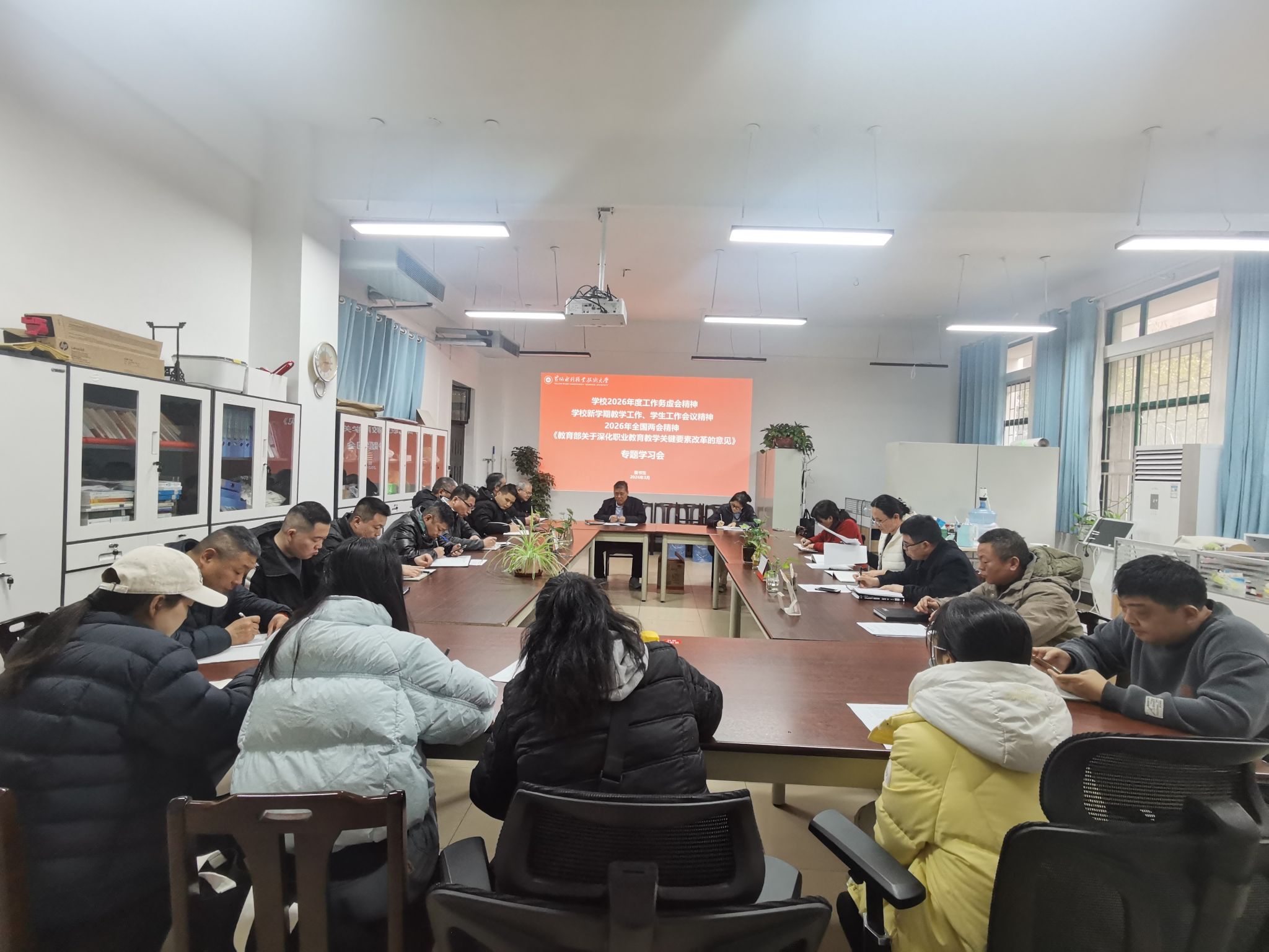 为贯彻落实《黄河水利职业技术大学2026年上半年教职工政治理论学习及思想道德教育计划》学习要求,3月17日,全校各部门、各单位分别组织教职工传达学习学校2026年度工作务虚会精神,学校新学期教学工作、学生工作会议精神,2026 年全国两会精神和《教育部关于深化职业教育教学关键要素改革的意见》,引导全校教师坚持以习近平新时代中国特色社会主义思想为指导,深入贯彻党的二十大和二十届历次全会及全国教育大会精神,落实立德树人根本任务,为推动教育高质量发展、建设教育强国贡献力量。(供图:各相关部门)
