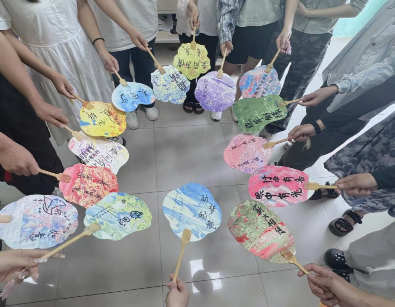 活动现场,同学们以资助育人为灵感源泉,挥洒创意,在扇面上尽情绘画书写,将内心的感激与憧憬化作一幅幅生动传神的图案。他们精心调配漆色,于水面上勾勒出细腻雅致的花纹,再将扇子缓缓浸入,待其轻盈浮起,一把把既具艺术价值又饱含文化底蕴的漆扇便跃然眼前。