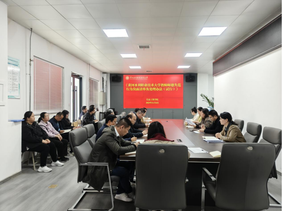 为贯彻落实《黄河水院2025年下半年政治理论学习及思想道德教育计划》学习要求,11月4日,信息工程学院在SY4426会议室组织召开教职工专题学习会议,集中传达学习《黄河水利职业技术大学教师师德失范行为负面清单及处理办法(试行)》(黄水党〔2025〕16号)和《黄河水利职业技术大学2025年师德师风建设工作方案》,引导全院教师准确把握师德师风建设的核心要求和具体内涵,切实不断提升学院师德师风建设水平。