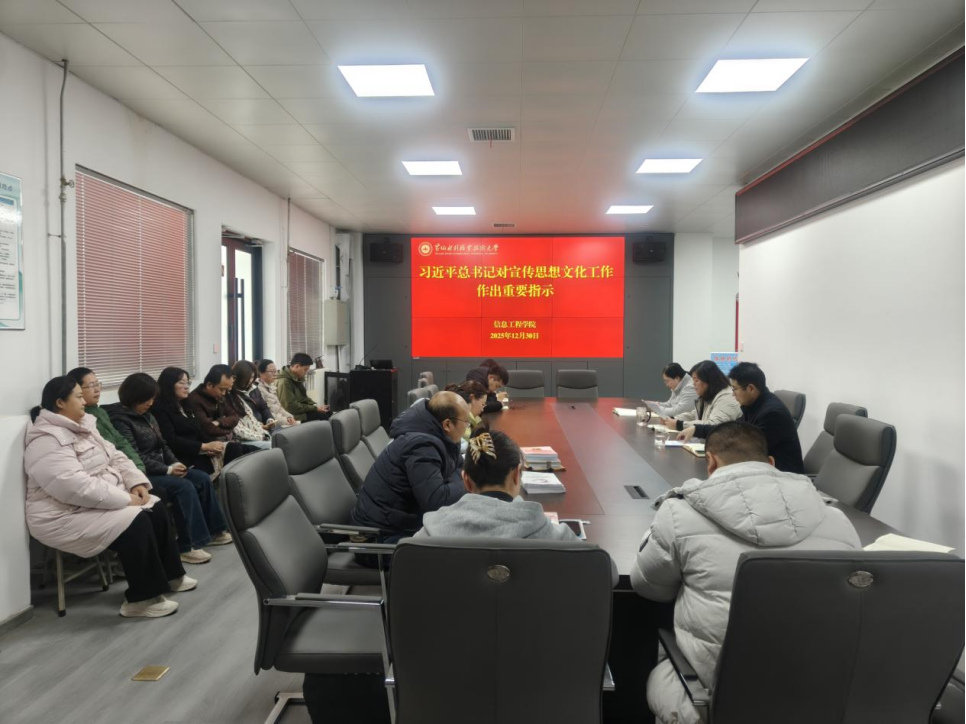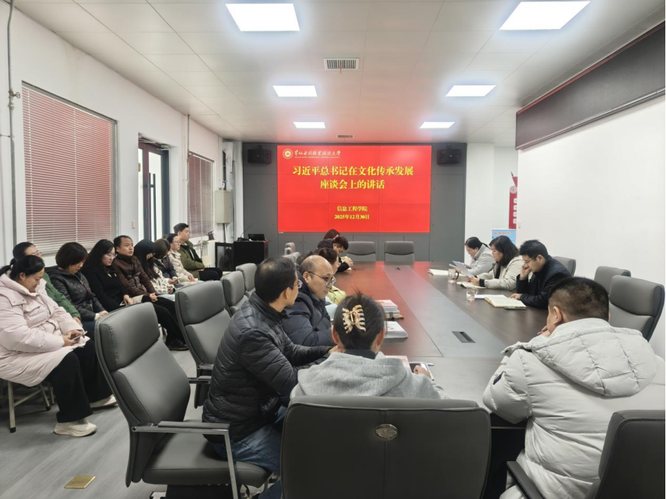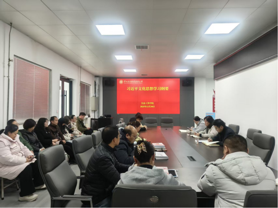 为贯彻落实《黄河水院2025年下半年政治理论学习及思想道德教育计划》学习要求,12月30日,信息工程学院在SY4426会议室组织开展教职工专题学习活动,传达学习习近平总书记对宣传思想文化工作作出重要指示、习近平总书记在文化传承发展座谈会上的讲话和习近平文化思想学习纲要,引导广大师生进一步学懂弄通做实习近平新时代中国特色社会主义思想,深入学习贯彻习近平文化思想,更加深刻领悟“两个确立”的决定性意义,增强“四个意识”、坚定“四个自信”、做到“两个维护”。