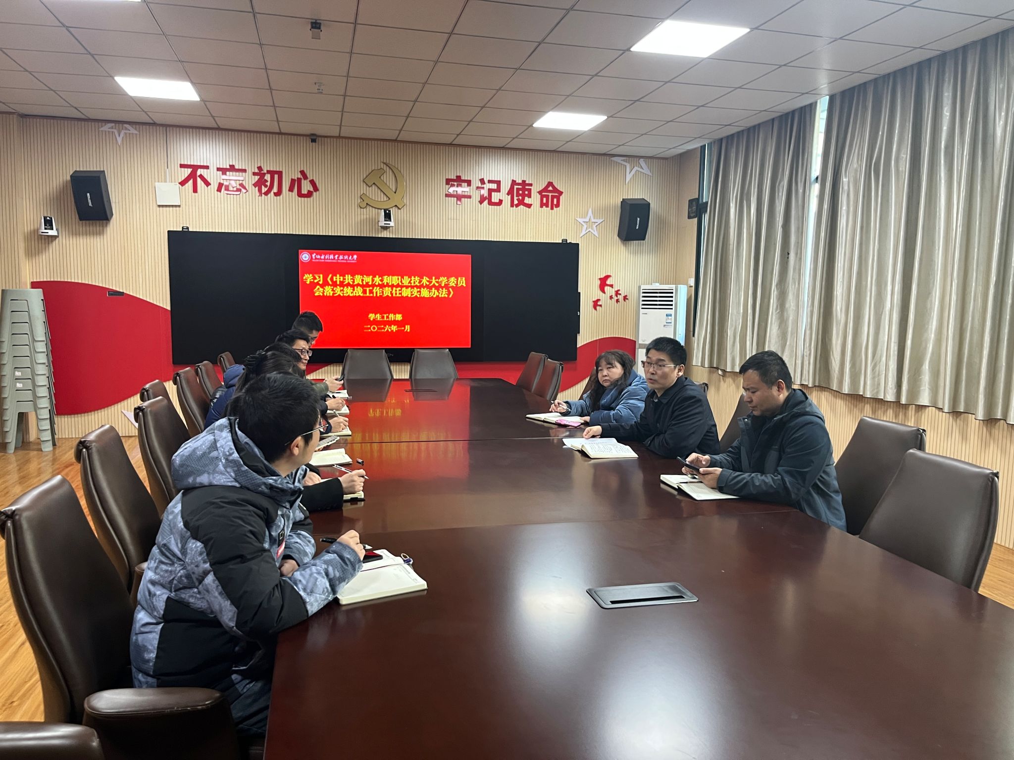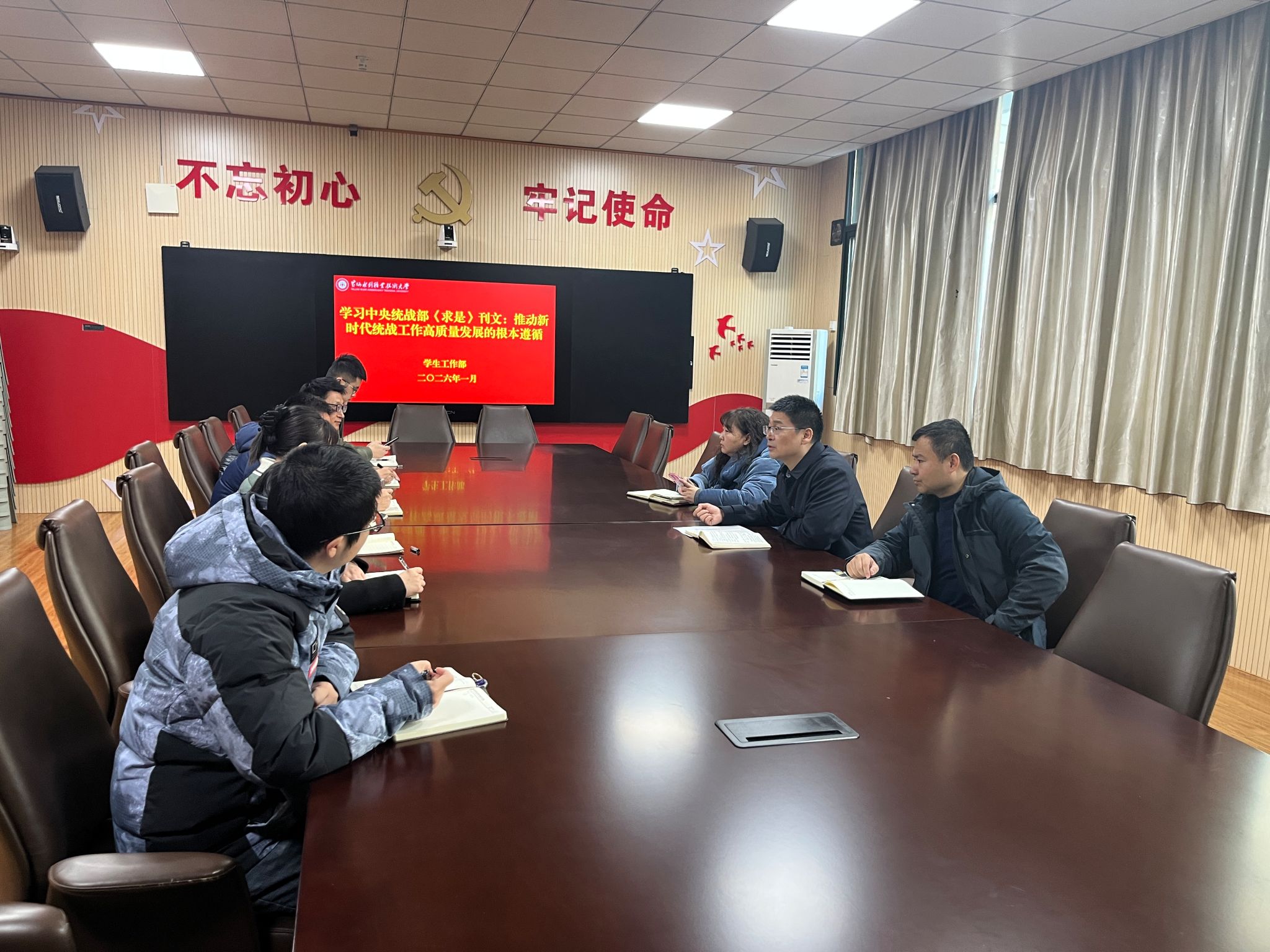 1月13日,学生工作部召开2025年下半年第九次政治理论学习专题会,聚焦中央统战部《求是》刊文《推动新时代统战工作高质量发展的根本遵循》及《中共黄河水利职业技术大学委员会落实统战工作责任制实施办法》展开深入学习研讨。会议由学生工作部部长商坤主持,部门全体成员参加,旨在深刻领会新时代统战工作的核心要义,精准把握学校统战工作责任制要求,推动统战工作理念与学生教育管理服务深度融合,凝聚全员育人强大合力。