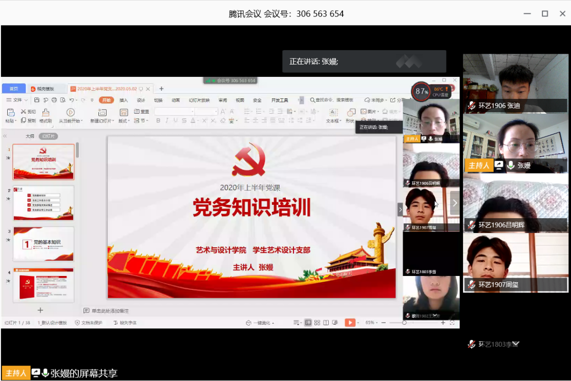 为深入学习贯彻党的十九大精神和习近平新时代中国特色社会主义思想,进一步加强理论武装、锤炼党性,提升党务知识水平,5月3日上午9点学生艺术设计支部书记张嫚在线为2020年上半年入党积极分子、发展对象及新发展党员上了一堂生动的党务知识专题党课。