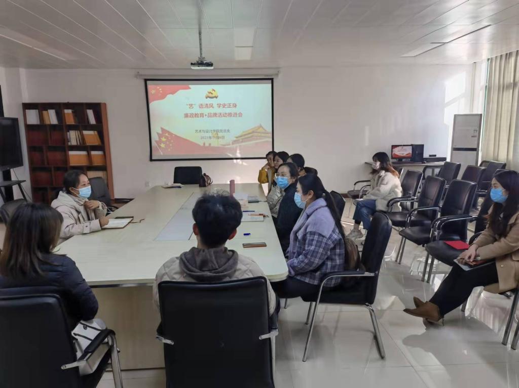 艺术与设计学院于2021年11月9日下午在党员活动室召开“艺‘语’清风·学史正身”廉政教育+品牌创建活动推进会,会议由党总支书记耿亚杰主持,参与此次活动的部分专业教师参加会议。