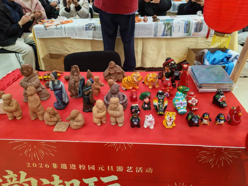 活动现场处处洋溢着浓郁的文化氛围,非遗展示区里,泥塑作品造型生动,或为憨态可掬的生肖形象,或为惟妙惟肖的人物百态,泥土的质朴与匠人的巧思完美融合;苏绣摆件精致典雅,荷花、花鸟等纹样在绣娘的针线下栩栩如生,丝线交织间尽显东方美学韵味。此次活动打破了非遗文化与校园生活的壁垒,让学生在亲手实践中触摸非遗脉搏,感受传统文化的深厚底蕴,也为元旦佳节增添了浓郁的文化气息。