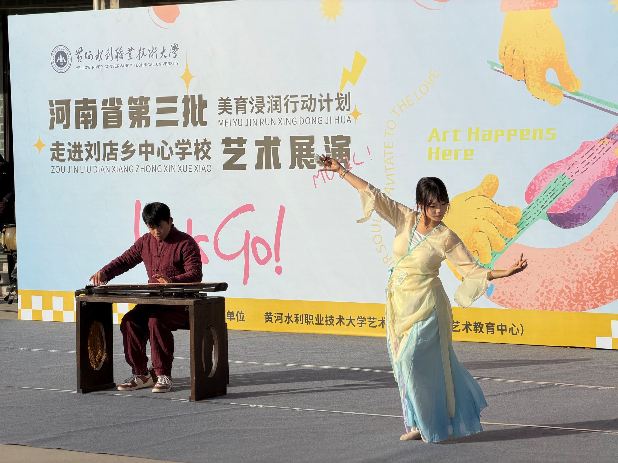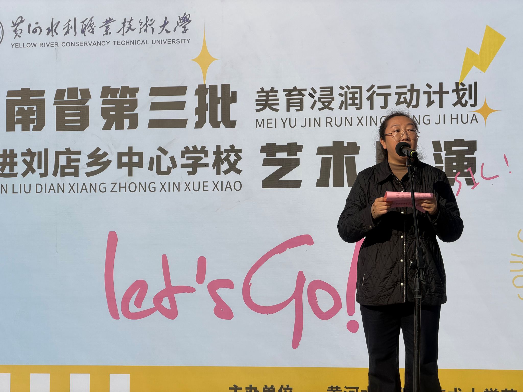 为深入落实河南省教育厅全面实施学校美育浸润行动计划,深化校地美育帮扶协作,11 月 25 日下午,黄河水利职业技术大学艺术与设计学院师生团队走进帮扶单位开封市刘店乡中心学校,带来了一场精彩纷呈的美育浸润展演。刘店乡政府、刘店乡中心学校、黄河水利职业大学艺术与设计学院等相关领导和老师出席此次活动。刘店乡乡长李明、黄河水利职业大学艺术与设计学院院长鄢彬彬分别致辞。刘店乡中心学校全体师生观看了展演。