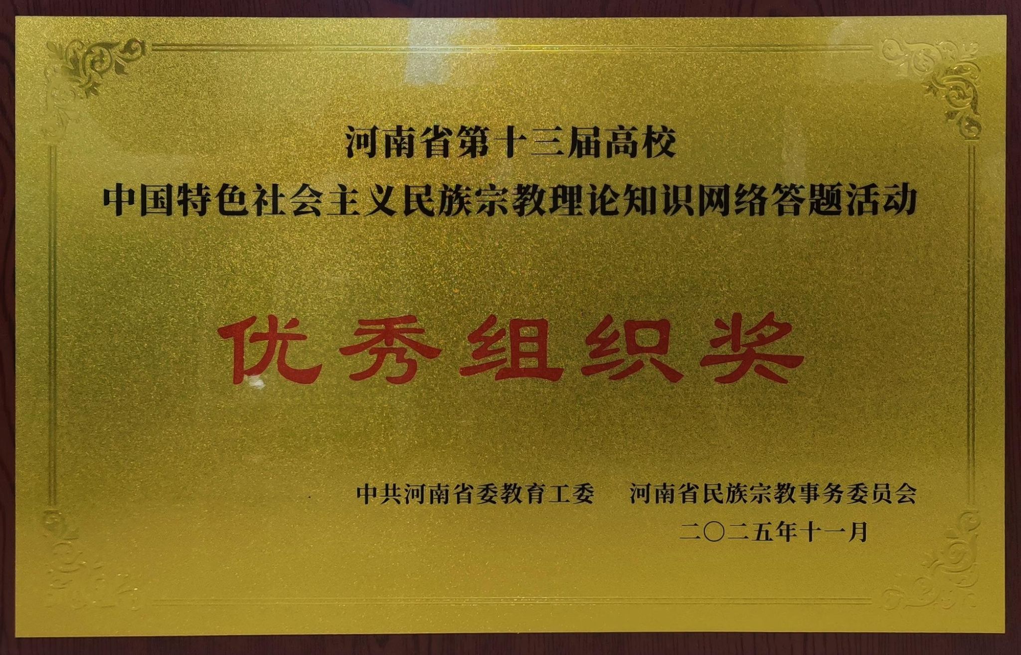 近日,河南省民族宗教事务委员会办公室、河南省教育厅办公室、河南省体育局办公室联合印发通知,正式公布“豫来豫亲”--铸牢中华民族共同体意识主题教育实践活动评选结果。在全省高校中国特色社会主义民族宗教理论知识网络答题活动中,我校荣获优秀组织奖,环境工程学院张遥等19名同学荣获优秀参与奖。在全省高校铸牢中华民族共同体意识主题征文比赛中,机械工程学院教师王敏、环境工程学院教师孙莉莉荣获二等奖。